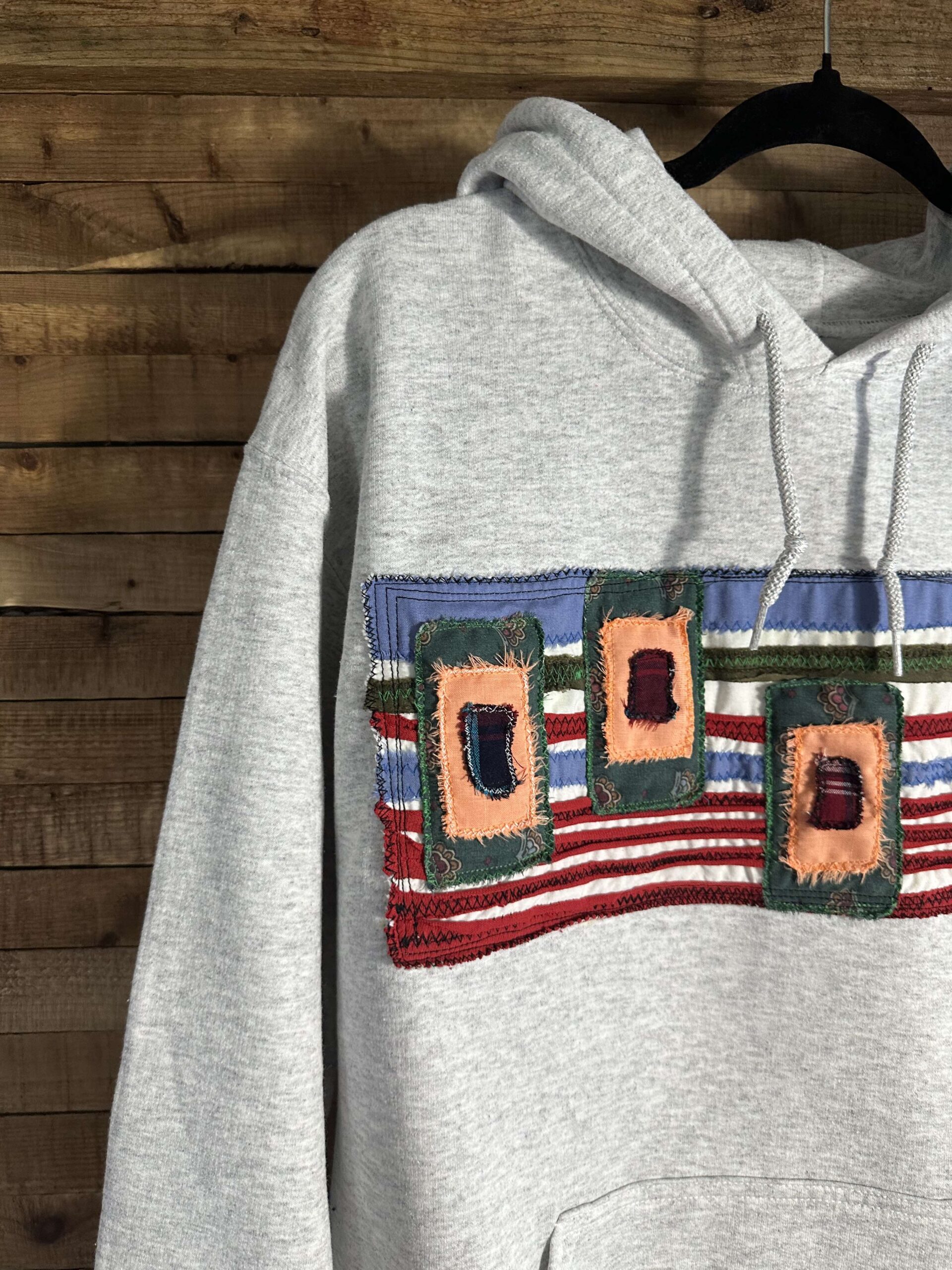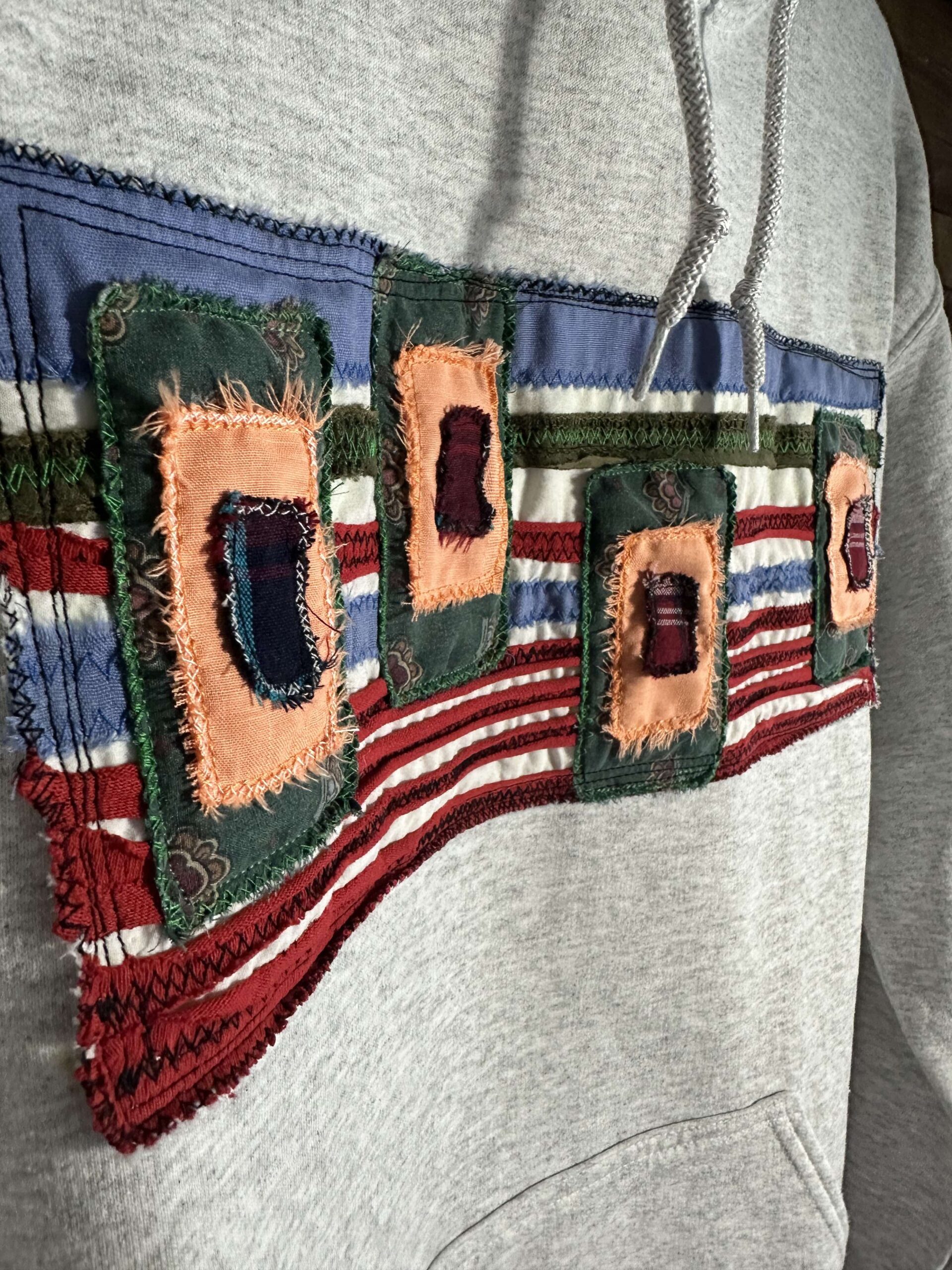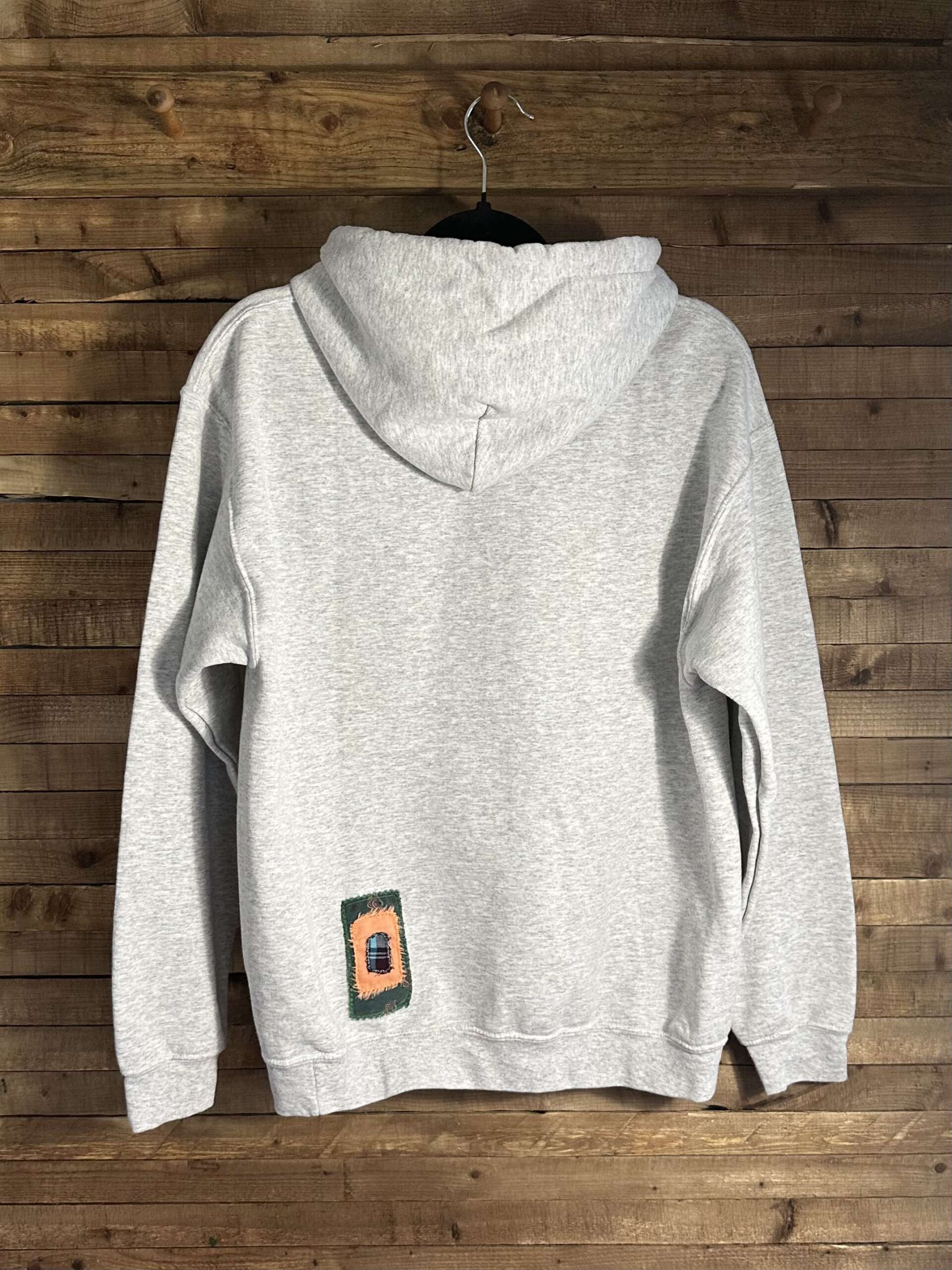 This Slappy Sweater is hoodie that is ultra light grey. The rectangular overlay on the front of the sweater is a rich layering of tactile elements, imbued with a forever hip colour palette. Featuring a “bumper sticker” overlay on the back of the sweater. This Slappy Sweater has everything and more.