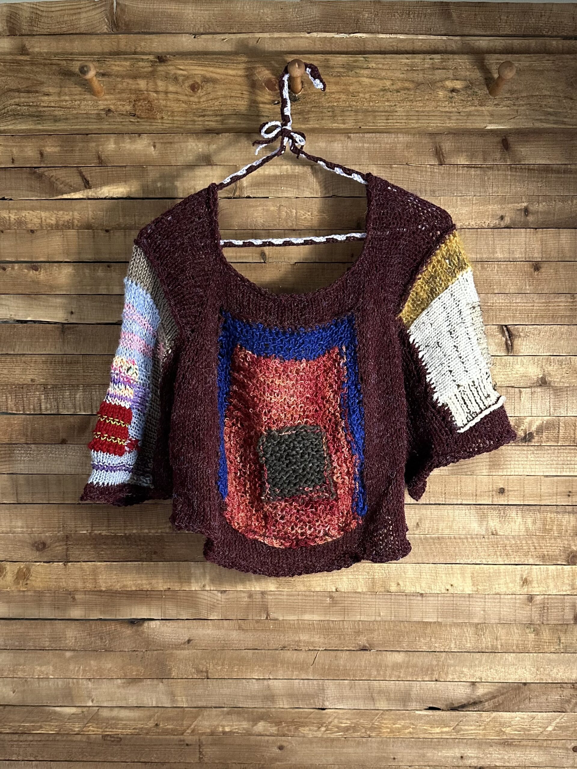 This Slappy Sweater is Handmade and has a maroon base with a vibrant palette of brilliant colours, showcasing a free-spirited and carefree personality. The stretchy and flowy knit adds to its relaxed, effortless charm, making it a perfect choice for those who value comfort and self-expression.