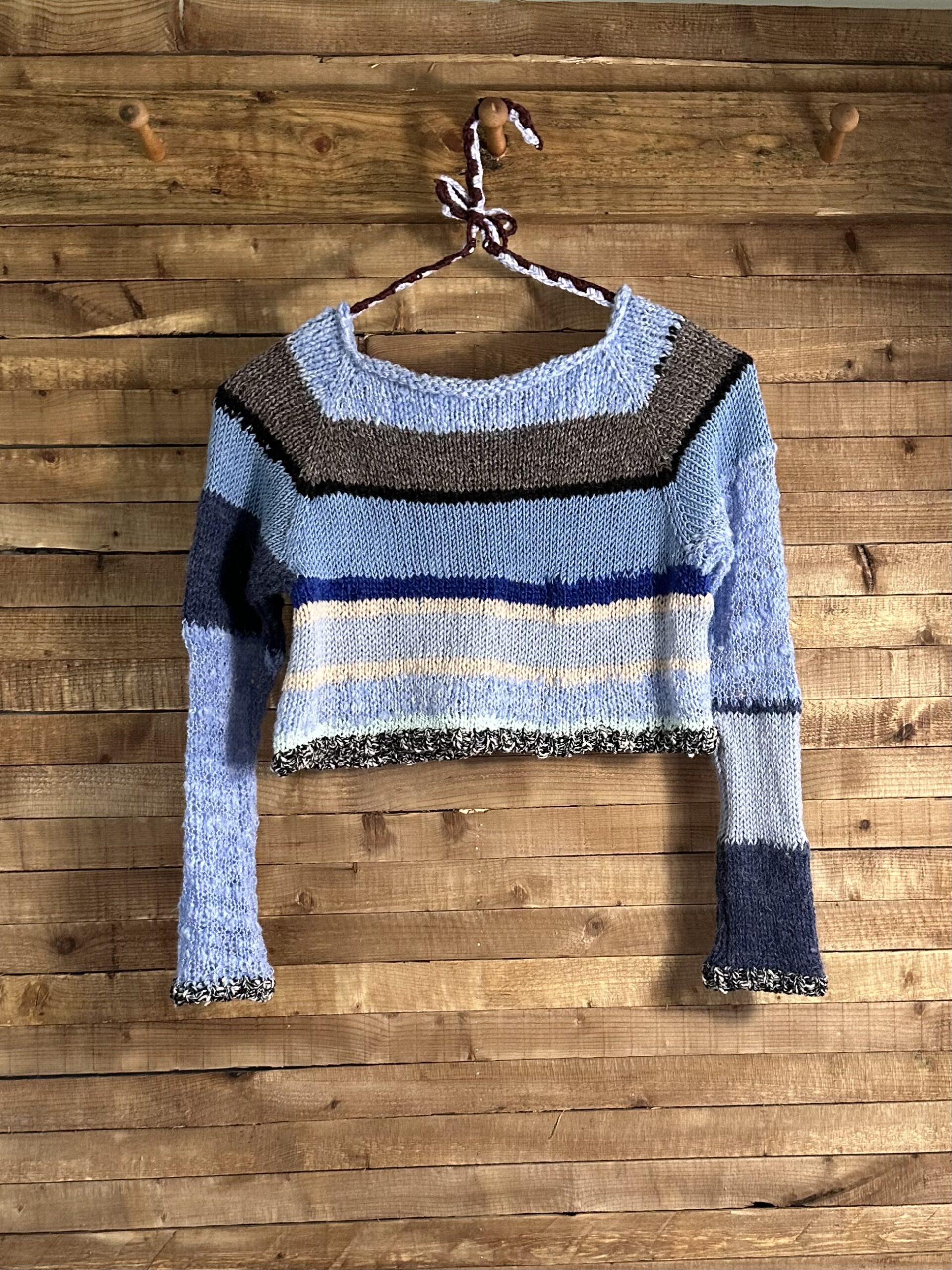 This Slappy Sweater is handmade and vibrant with multiple shades of blue, a radiant display of fun and fit. The different weights of yarn yields a fabric with contrasting texture creating a modern knit aesthetic.